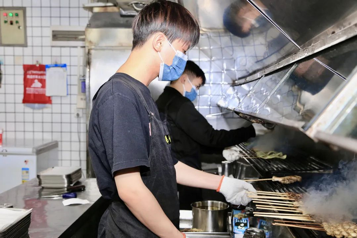一走进兄弟情烧烤店,“一个人撸的是心情、两个人撸的是默契、三个人撸的是江湖,烧烤不能没有你”的装饰墙,道出了烧烤之所以能成为平凡生活里的热辣慰藉所在。兄弟情烧烤店的创立者安徽宣城三兄弟,从摆摊开始,调制酱料、亲自串串,再到10平方米的小店面,3张桌子、几个蒙古包,一点点做到现在三家店面,甚至有浦东、崇明的粉丝特意而来,“我们仨是表兄弟、堂兄弟,从一个人摆摊到三兄弟齐心做,我们希望能够走得更久远。”三兄弟中最小的汤文杰说道,“我们现在就是要做好每一道程序,让顾客吃得放心、安心、开心。”