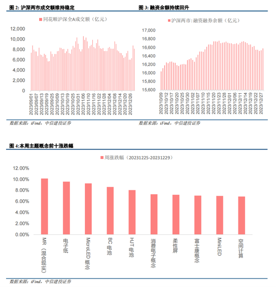 融资余额震荡回升,MR概念重新活跃。本周沪深两市主板成交额经历前三日的大幅缩量后,放量修复。两市融资余额先降后升,近两日恢复至16578亿元。市场主题概念方面,MR概念重新活跃。12月28日晚,一份华为MR调研纪要中提到,华为在2024年有两款规划的产品,一款是MR头显产品(VST方案),通过透视功能观察外部的真实环境,与苹果Vision Pro、Quest和PICO方案类似。华为MR产品的披露重新点燃MR概念。