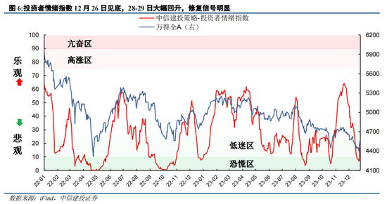 我们持续密切跟踪的投资者情绪指数也能够反映出近期市场情绪见底回升的情况。在我们市场情绪跟踪12月报:从再陷恐慌到重燃希望 中,我们指出12月情绪指数持续走弱,从月初接近50一路降至26日7以下的水平。不过28日、29日投资者情绪意外大幅改善。这既是大跌后市场自身超跌反弹的要求,也可能与机构年末自救拉抬机构重仓股、外资圣诞节假期后进行资产再配置等因素有关。展望2024年一月,我们认为情绪指数的回暖仍有望继续,市场或将进入修复行情。