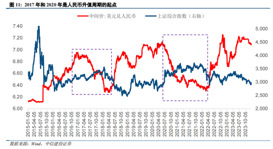 自今年年初以来,随着美联储持续加息,9月上旬人民币对美元即期汇率曾一度走贬至 7.35左右。进入四季度,人民币汇率开始企稳回升,11月中旬以来,人民币对美元即期汇率从7.30一线强势反弹至近期的7.10。然而在市场极度悲观的情况下,对这一利好视而不见,预计后续市场将会从情绪底走出,逐步开始定价。基于美联储货币政策的口径转松:目前加息周期已经结束,处于等待降息阶段的客观事实;以及外资对中国资产的预期修复,我们认为目前可能处于人民币升值周期的起点,后续将支撑长期行情。复盘历史,在2017年和2020年的人民币升值周期中,给A股提供重大利好。