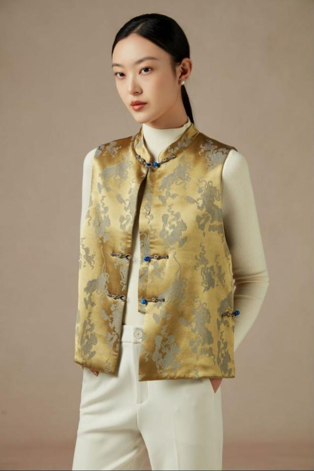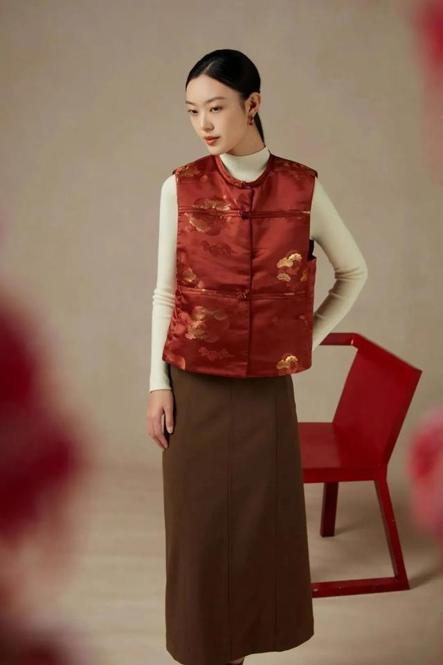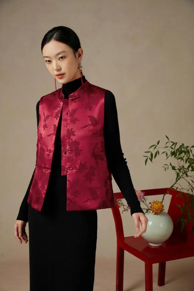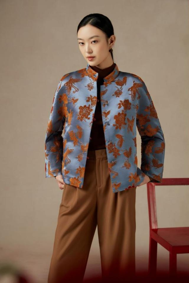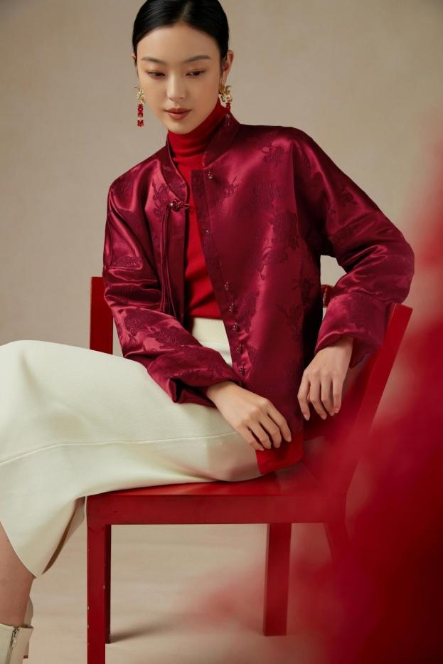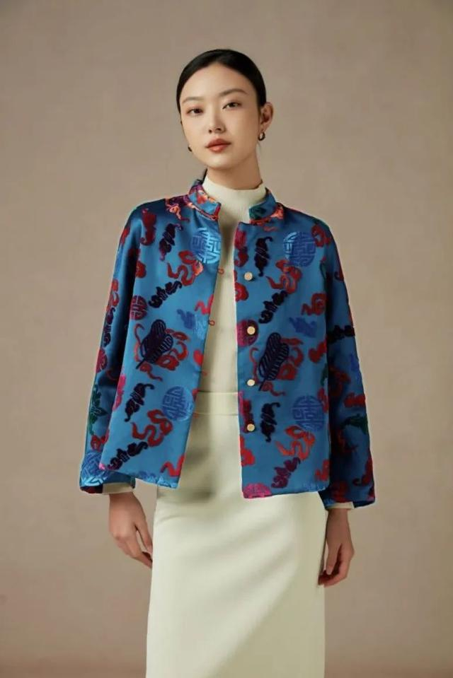 一件不容错过的“真丝冠乐绉”中式年服,借鉴了中国传统的织锦工艺鲜明的色彩,通过特殊的织法,使得面料表面呈现出如同冠乐绉一样的纹理,既增加了外套的层次感,又赋予了其独特的艺术韵味。凸显出新年的主题,将华美与温柔平衡得恰到好处,富贵且高级。