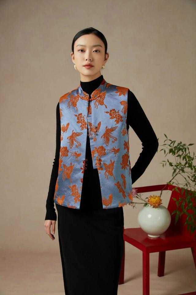 漳缎100%桑蚕丝蝶恋花影青夹棉马甲