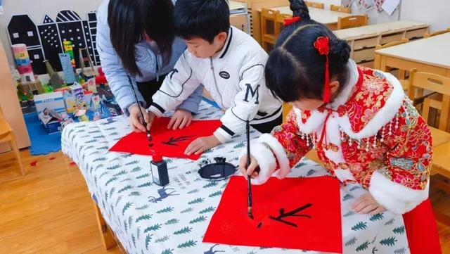 海贝幼儿园里早已是红红火火的一片。门窗、墙面、吊饰,暖洋洋的红色诉说着师幼对新年的美好期盼。剪窗花、画对联、挂灯笼,中华传统文化的魅力在孩子们的手中流淌。