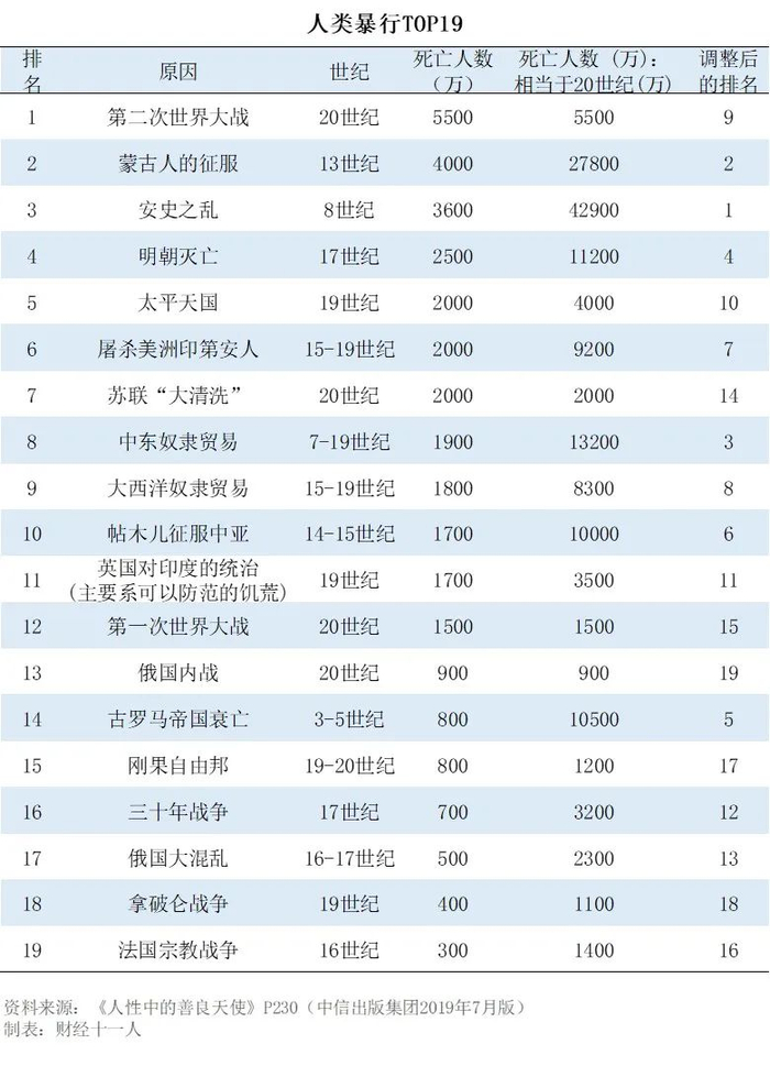 到了20世纪下半叶,人类的大规模死亡主要不是因为战争,而是有组织的国家暴力。例如,柬埔寨1/5的人口死于波尔布特政权不到四年的执政。一项研究指出,20世纪前,专制政府一共杀死了6.26亿自己的人民,20世纪又杀死了1.21亿-1.69亿人。