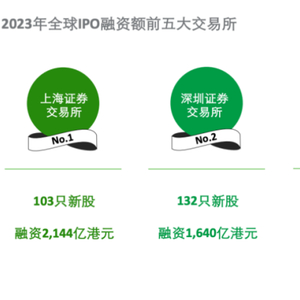 2023年,除了一季度外,后三个季度港股新股上市乏力。全年整体新股融资总额和融资数量均为过去二十年以来的低位,跌出全球IPO融资前五位置,排名第六位。德勤数据显示,上交所、深交所、纳斯达克及纽交所维持环球新股融资额排行榜前四位置,印度国家证券交易所上升至第五位。