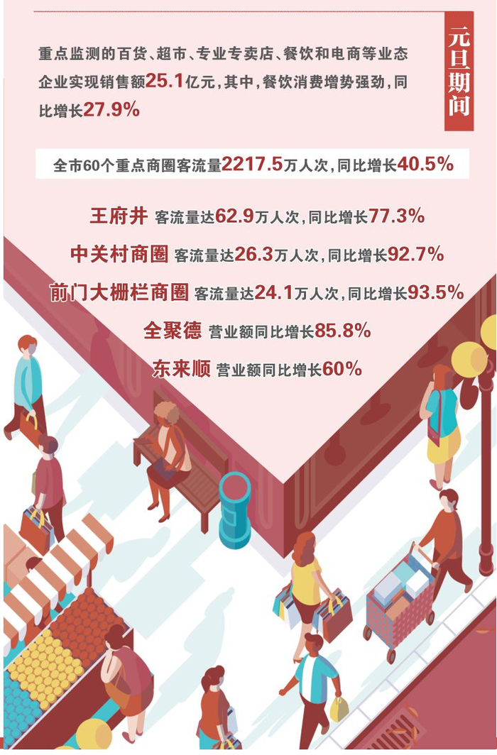 1月1日,北京市商务局发布数据显示,元旦期间,重点监测的百货、超市、专业专卖店、餐饮和电商等业态企业实现销售额25.1亿元。其中,餐饮消费增势强劲,同比增长27.9%。全市60个重点商圈客流量2217.5万人次,同比增长40.5%。