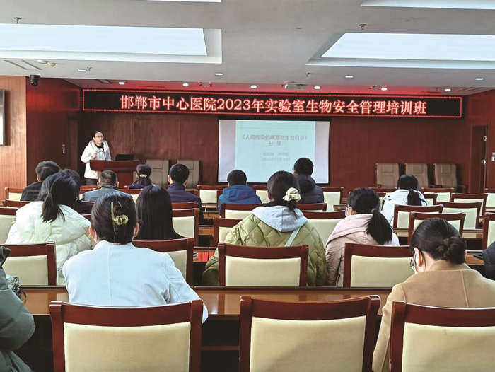 2023年11月30日,市中心医院举办了“邯郸市中心医院2023年度实验室生物安全管理培训班”。市中心医院副院长齐俊娟参加活动,该院科研科、检验科、临检科、病理科、输血科、生殖医学科、核医学科(精准医学中心)等实验室人员180余人参加培训。
