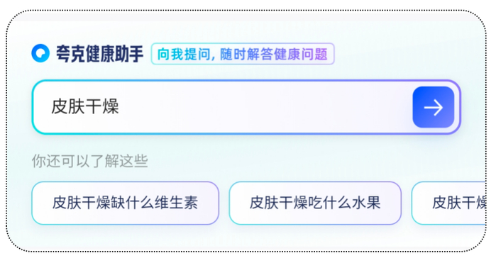 针对皮肤问题,大家可以向【夸克健康助手】进一步提问。“皮肤干燥的日常护理方法有什么?”“皮肤干燥去医院需要做什么检查?”
