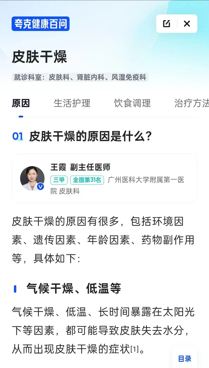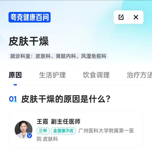 如果遇到以上的问题,除了就医咨询,还可以使用夸克APP,在上面搜索“皮肤干燥脱皮”,查看相关病因、生活护理、饮食调理等权威解答。这些内容由200多位权威医学专家领衔编审,与60多家全国三甲医院、40多个医学机构合作,提供实用易懂的病症讲解、治疗建议。