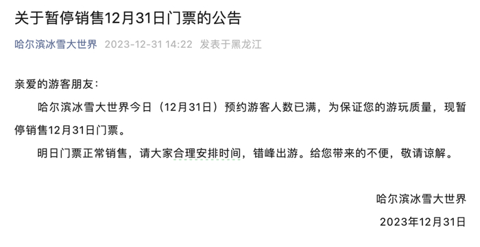 其中,日前连续多日成为热搜话题的哈尔滨冰雪大世界在2023年12月31日下午2时22分就宣布预约游客人数已满,暂停销售门票。