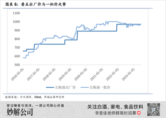 我们能看到,疫后商务活动所需的高端白酒需求疲软后,普五一批价一直徘徊在969元出厂价上下,最低时价格仅有940元/瓶。若此时跟随茅台提价,可能会带来对五粮液需求的抑制。