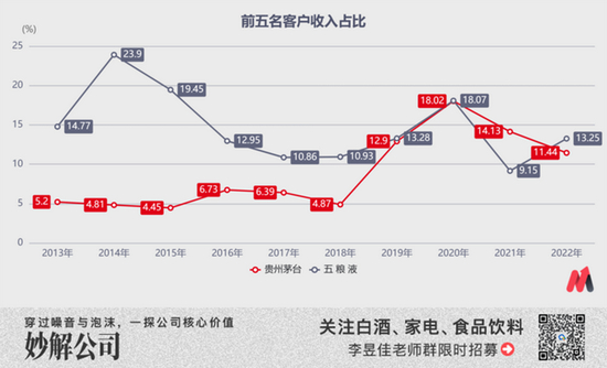 五粮液效仿茅台推行小商制,改革在2019年就已基本完成,对比其与茅台的前五名经销商营收占比,2020年二者均为18%,2021年五粮液为9.15%,茅台为14.13%;2022年五粮液比茅台高1.81个百分点。