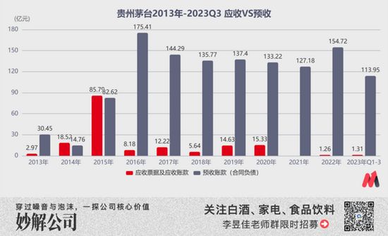 一是茅台严格先款后货的小规模应收票据及账款,二是占用经销商资金的大规模预收账款。
