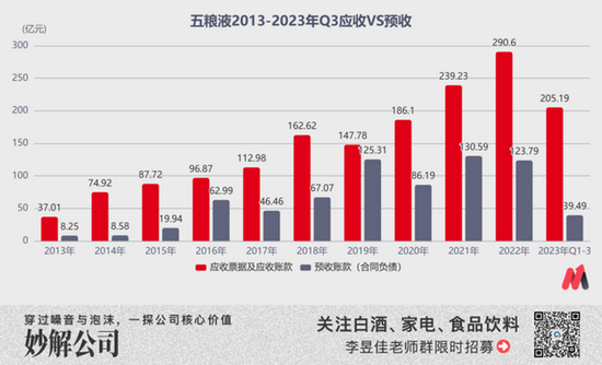 2022年,茅台预收账款高达154.72亿元,应收票据及账款仅1.26亿元,五粮液则正相反,应收票据及账款合计290.6亿元,预收账款123.79亿元。2023前三季度,茅台的预收款与应收款差额为112.64亿元,五粮液的则为-165.7亿元。