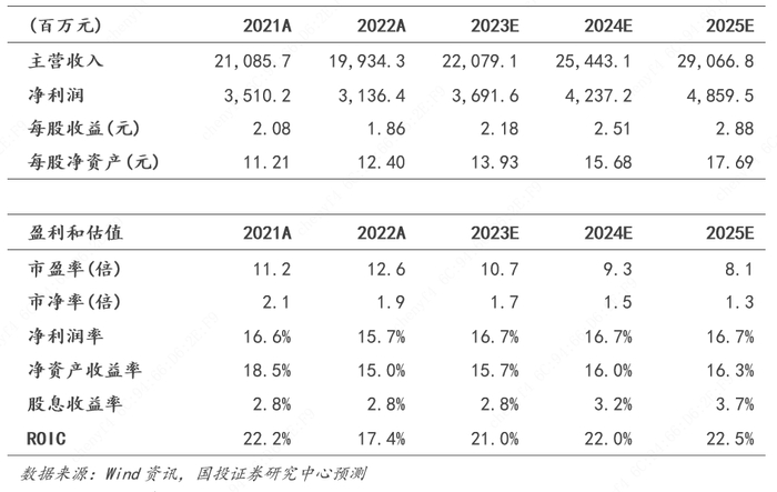 ■投资建议:看好公司一体两翼布局下的长期成长,暂不考虑嘉宝莉并表影响,预计公司2023-2025年总营收分别为220.79亿元、254.43亿元、290.67亿元,分别同比增长10.76%、15.24%、14.24%,分别实现归母净利润36.92亿元、42.37亿元、48.60亿元,分别同比增长17.70%、14.78%和14.69%%;EPS分别为2.18元、2.51元和2.88元,动态PE分别为10.7倍、9.3倍和8.1倍,给予“买入-A”评级,6个月目标价30.12元,对应2024年12倍PE。