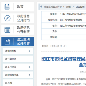 近期,阳江市市场监督管理局对全市食品餐饮单位开展食品安全监督抽检,共抽取351批次。经检验,抽样合格样品327批次,发现不合格样品24批次,不合格发现率6.84%(详见附件)。