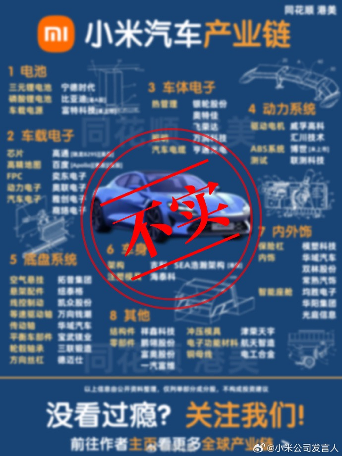 小米称网传“小米汽车产业链”图片内容至少有50%完全错误