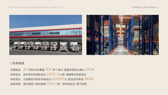 同时,为更高效地保障原料以更新鲜状态送达到门店,喜茶打造了41个原料仓库,覆盖300多个城市,覆盖范围同比增长270%。在这套南北跨越3,000公里的仓储网络的支撑下,喜茶全年原料控温配送达2,000万公里,大数据规划物流车路径达65,000次,保障原料的高效及时送达。喜茶还积极引入数字化工具保障原料品质,全年共使用原料溯源二维码约1,100万张,为原料配置“数字身份证”使品质可追溯。