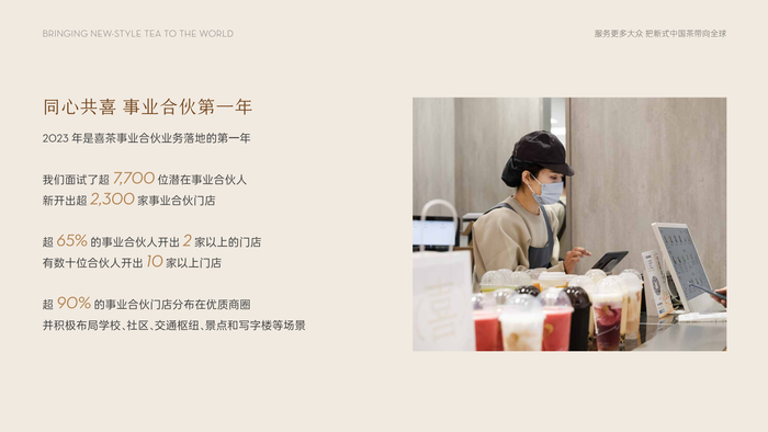 2023年是喜茶走向大众市场的第一年,也是喜茶事业合伙业务全面落地、海外市场加速的第一年,通过一年的发展,喜茶进入全球更多市场,服务了更多大众用户。