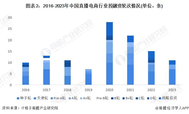从2016-2023年12月直播电商制造相关行业的投资轮次分析,目前直播电商相关行业的融资轮次仍然处于早期阶段,融资事件主要集中B轮以前。
