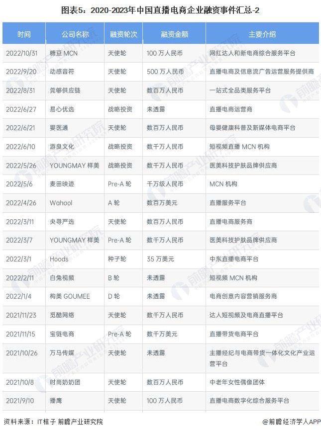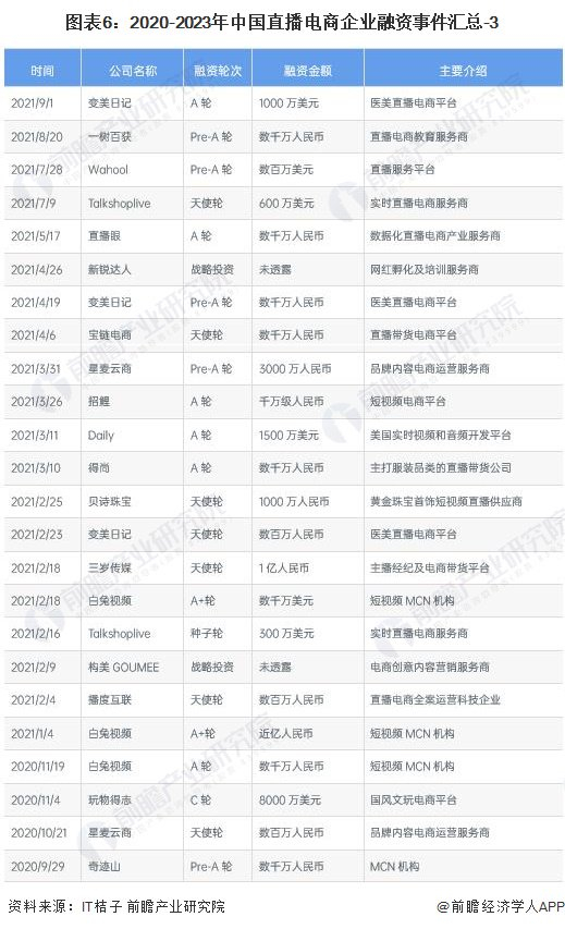 2020-2023年,直播电商行业投融资活跃度良好,投融资轮次主要集中在B轮及以前、战略融资。企业投融资直播电商细分板块丰富,其中包括农村直播电商、MCN机构、医美直播电商等。
