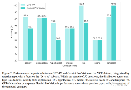 关于多模态数据集,图2详细介绍了GPT-4V和GeminiPro Vision在不同问题类型上的性能比较。