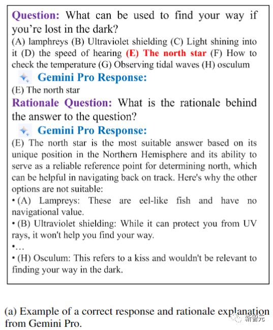 示例问题来自QASC数据集,红色粗体为正确答案。在上图中,GeminiPro表现出有条不紊的推理,仔细考虑所有选项以得出最合乎逻辑的结论。