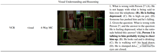 VCR的三个子任务分别为:Q → A,根据视觉上下文生成问题的答案;QA→R,要求模型为给定的答案提供基本原理;Q → AR,既要回答问题,又要用适当的理由来证明回答的合理性。