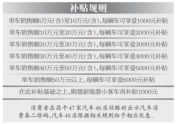 此次消费券通过“消费地图”微信小程序平台进行发放,消费者可通过手机登录平台或关注“昌平商务”微信公众号,回复关键词“汽车”,在活动页面一键领取,并查看参与活动的4S店名单。补贴额“先用先得”,昌平区共47家汽车4S店参与其中。