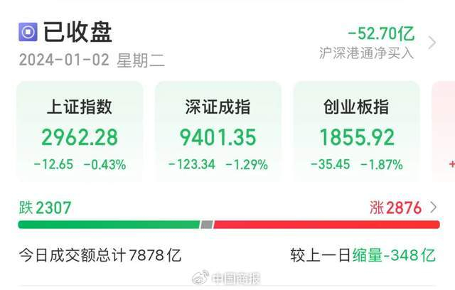 中国商报(记者 王彤旭)2024年1月2日,新年首个交易日,三大股指齐跌收盘。其中,沪指跌0.43%,深成指跌1.29%,创业板指跌1.87%。只有北证50指数“一枝独秀”,涨2.08%。沪深两市成交额7878亿元,超2800只个股上涨,北向资金全天净卖出52.7亿元。