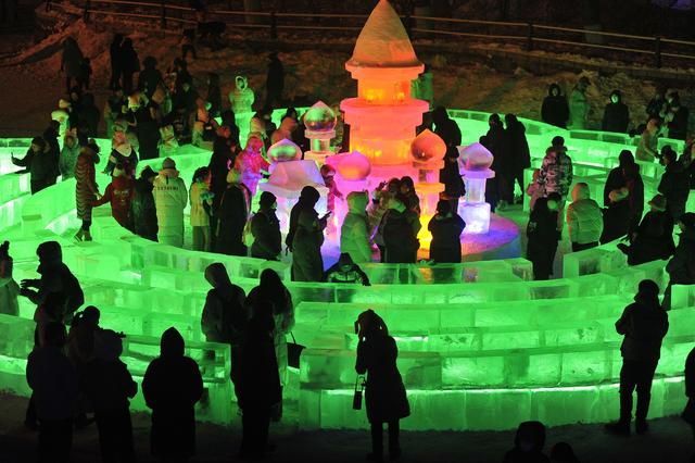 1月1日,哈尔滨一公园内,冰灯艺术游园会吸引市民前来参观、游玩。图/IC