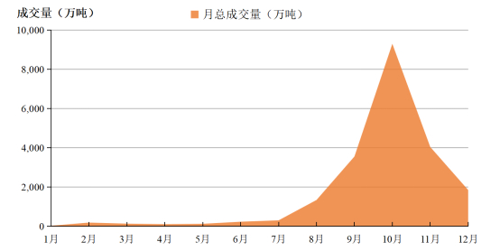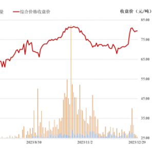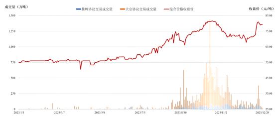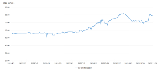 从成交价格看,2023年每日综合价格收盘价在50.52元/吨-81.67元/吨之间。12月29日收盘价79.42元/吨,较2022年最后一个交易日(2022年12月30日)上涨44.40%。2023年市场成交均价68.15元/吨,较2022年市场成交均价上涨23.24%。