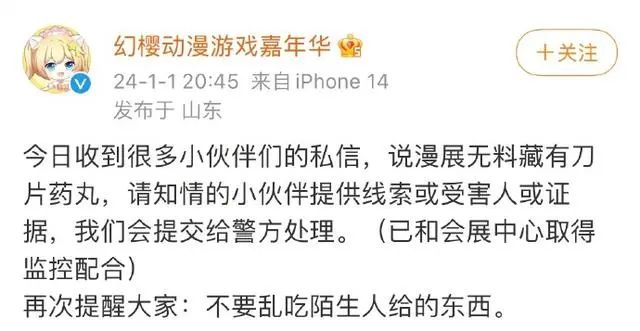 1月1日,在接到多位网友私信反映的情况后,当天20点45分,“幻樱漫展”官方也通过社交媒体发出提醒:“请知情的小伙伴提供线索或受害人或证据,我们会提交给警方处理,(已和会展中心取得监控配合),再次提醒大家:不要乱吃陌生人给的东西。”