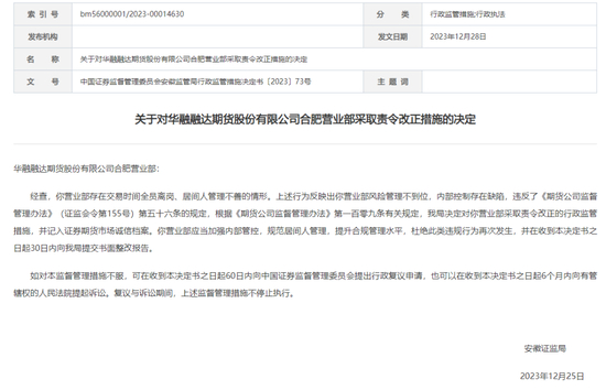 安徽证监局查明,华融融达期货合肥营业部存在交易时间全员离岗、居间人管理不善的情形。上述行为反映出营业部风险管理不到位,内部控制存在缺陷,违反了《期货公司监督管理办法》(证监会令第155号)第五十六条的规定。安徽证监局同样对该营业部采取责令改正的监管措施,并记入证券期货市场诚信档案。