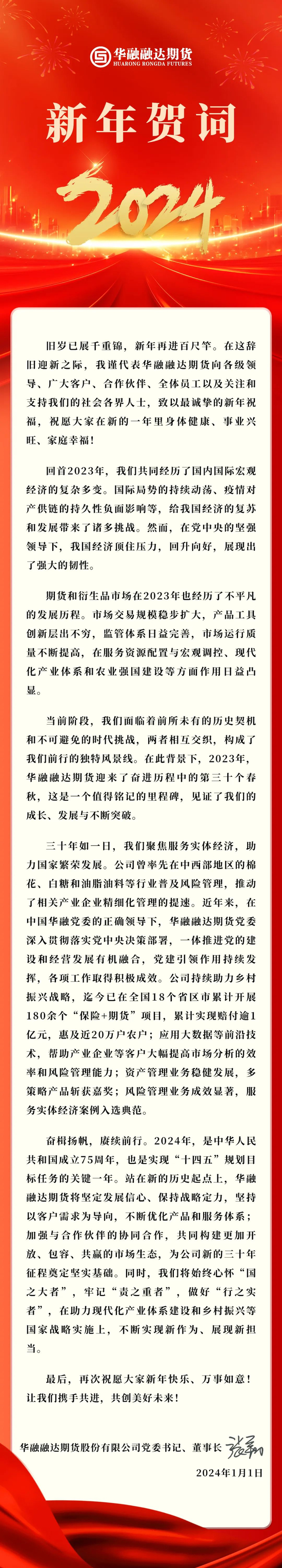 1月2日,华融融达期货官网发布了2024新年贺词,其中强调“2023年是一个值得铭记的里程碑,见证了我们的成长、发展与不断突破”。