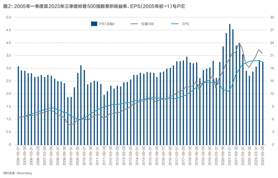 截至2023年三季度,标普500指数的累积收益率是260%,EPS相比2005年初增长了232%,指数的增长与EPS的增长相当,这表明标普500指数估值相对比较稳定,指数的上涨基本上来自EPS的增长。从图2中也可以看出来,标普500指数的走势与EPS的走势相当接近。