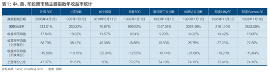 从最近的2013年至2023年12月15日十多年数据来看,沪深300、上证指数的年化收益率只有2.80%、2.59%,而道指、标普500、Nifty50和Sensex30年化收益率在10%至13%之间,纳斯达克指数的年化收益率更是高达16.10%。创业板指的年化收益率是9.31%,但它的波动率比其他估值大不少,因而它的Sharpe比率也是大幅低于美、印股市指数。