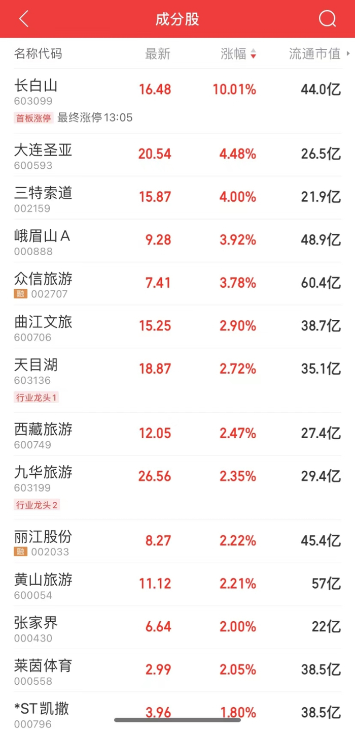 盘面上,景点及旅游板块在午后突然拉升,其中,长白山(603099.SH,股价16.48元,市值43.95亿元)涨停。