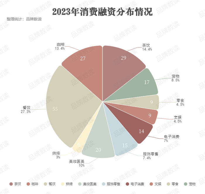 品牌数读统计显示,2023年全年,消费领域共计有201起投融资,与去年的300+起融资数量相比,出现明显的缩减。与线下消费复苏形势相匹配,在资本市场,与饮食有关的赛道都十分受资本的青睐,餐饮、咖啡、茶饮三个品类稳稳占据全年融资榜单的前三位