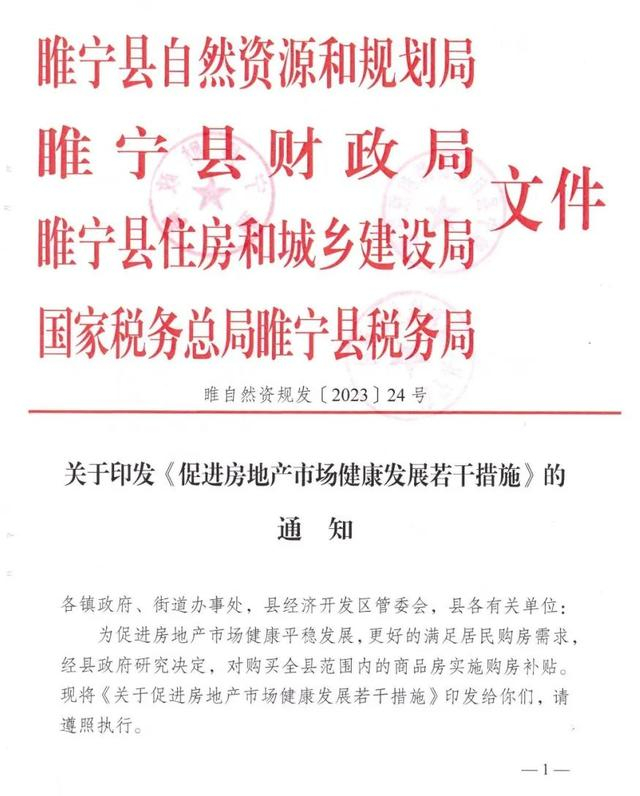 据江苏省徐州市睢宁县交通运输局1月1日发布的消息,2023年12月31日,睢宁县自然资源和规划局、睢宁县财政局、睢宁县住房和城乡建设局、国家税务总局睢宁县税务局联合发布关于印发《促进房地产市场健康发展若干措施》的通知,文件自2024年1月1日起施行。