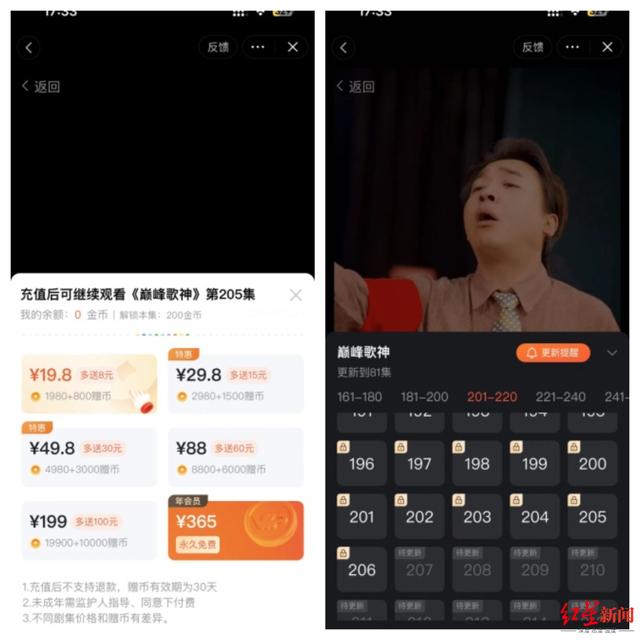 红星新闻记者实际操作、查询发现,目前抖音、快手都有收费短剧的存在,有的在短视频App内部小程序即可充值并观看,而有的则会跳转到微信小程序进行充值观看。通常能免费观看十几集,再继续看就需要充值。
