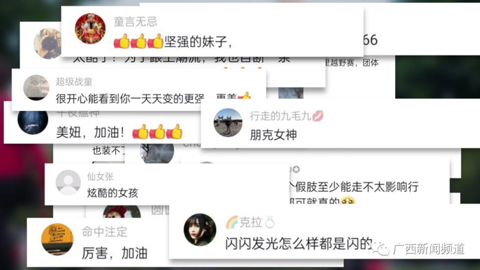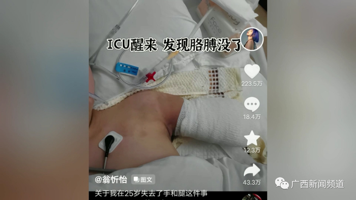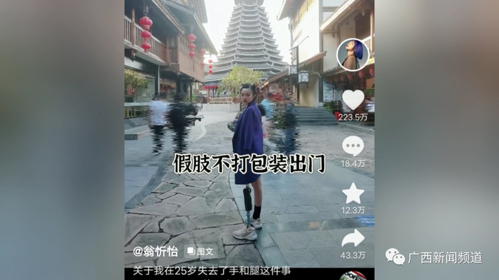 2023年12月29日,南宁女孩小翁右右从广州赶回南宁,参加了一个社区卫生服务中心的巡演义诊活动。舞台上的她自信美丽,大胆地晒出左边的假肢,毫不避讳让大伙知道她是一个残障女孩。2023年8月22日,小翁右右用40张照片编辑成的一条短视频在网络上获得了1.2亿的播放量,屡次登上网络平台的热搜榜单。这40张照片是她在2020年经历无情车祸、从健全人变成残障人士再浴火重生的缩影。她乐观地称自己为“右边形女战士”。