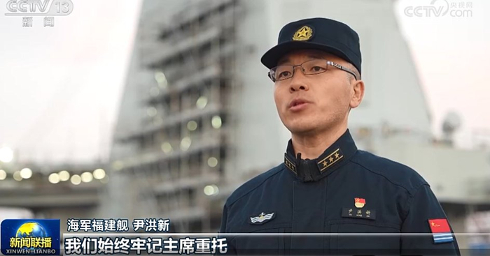 根据《新闻联播》画面,身着戎装、佩戴上校领章的海军福建舰尹洪新表示——