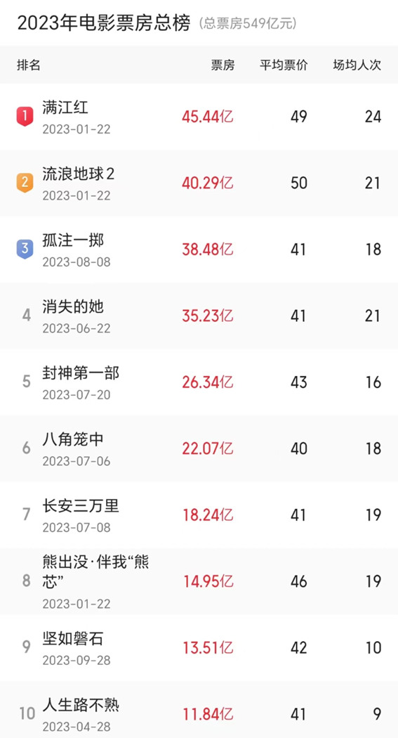 数据来了!2023年票房前10名均为国产片!