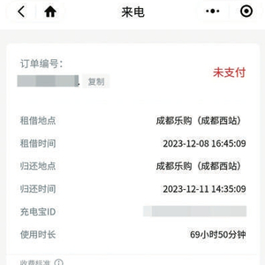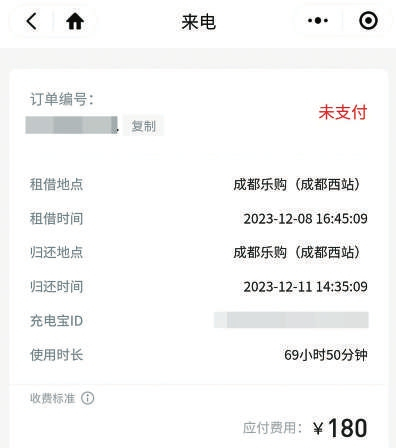 “2023年12月11日,微信提示向来电支付180元租借费,查看订单发现充电宝此时竟显示已归还,租借地点和归还地点都是成都乐购(成都西站)。我没有使用过充电宝,充电宝竟能在同一个地点自己弹出并归还?”任先生告诉记者,他的微信账户没有余额,来电给他开了180元的欠单。