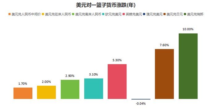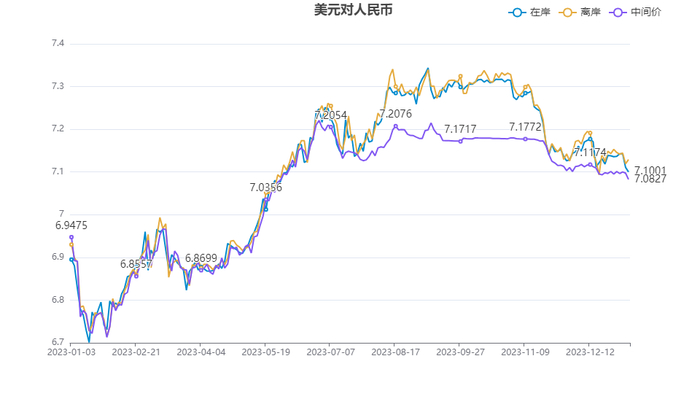 全年来看,人民币兑美元中间价累计调贬1181个基点,跌幅为1.7%,这一跌幅相较2022年的9.23%,大幅收窄;在岸人民币兑美元累计下跌1406点,跌幅为2.02%;离岸人民币兑美元累跌2038个基点,跌幅为2.9%。