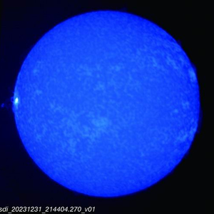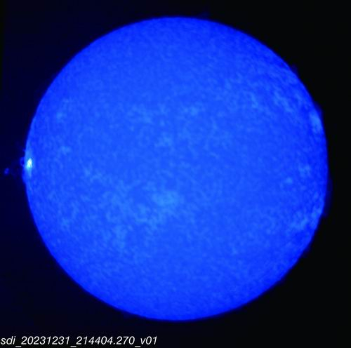 “夸父一号”卫星观测到莱曼阿尔法新波段下的X5.0级耀斑,蓝色全日面为宁静太阳的莱曼阿尔法波段辐射,左侧的白色亮点为耀斑爆发时莱曼阿尔法辐射增强。中国科学院紫金山天文台供图