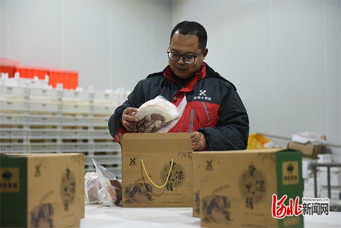 2023年12月30日,在深州市曹家小院生态农业开发有限公司,工人正忙着将猪肉装进礼盒送往各大超市。河北日报通讯员 高占峰摄