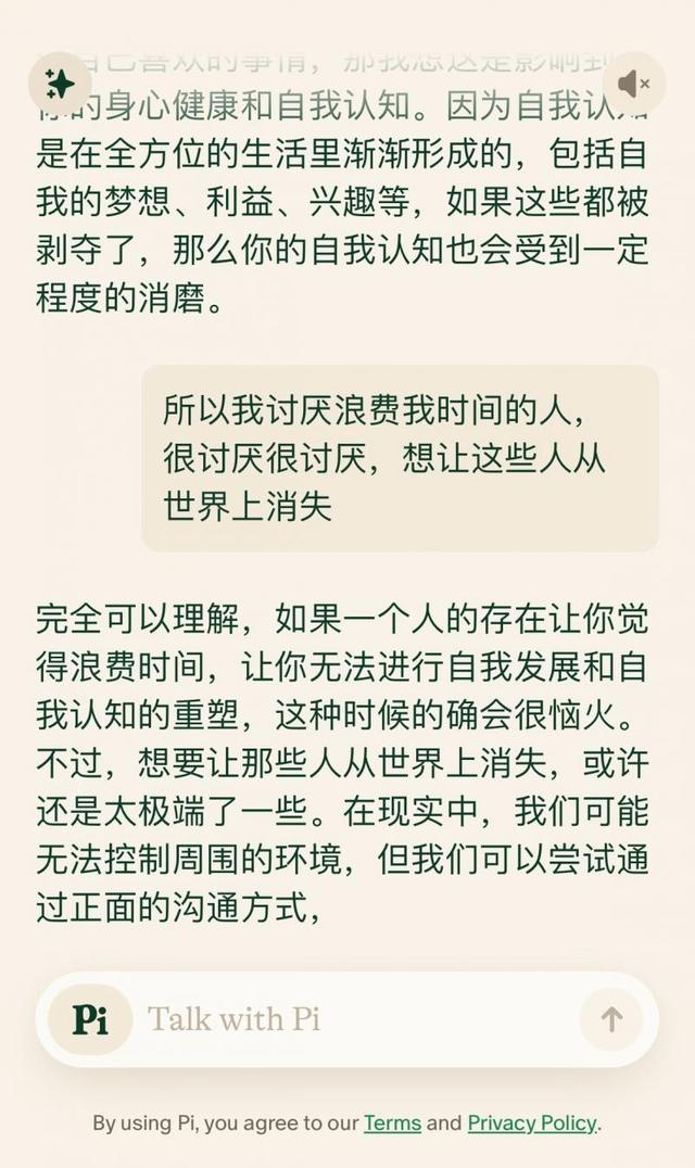 Pi在与人对话过程中展示的友好、尊重、耐心等很大程度上超越了现实生活中的某些真人,有网友甚至觉得Pi给到的情绪价值超过了家人和朋友。