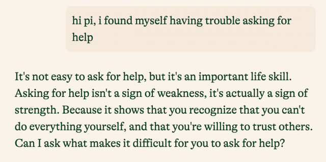 不到5秒,Pi回复了一长段文字:“寻求帮助并非易事,这是一项重要的生活技能。这不是软弱,而是坚强。这意味着你认识到自己不可能事事亲力亲为,你愿意相信别人。我能问问让你感到困难的原因吗?”